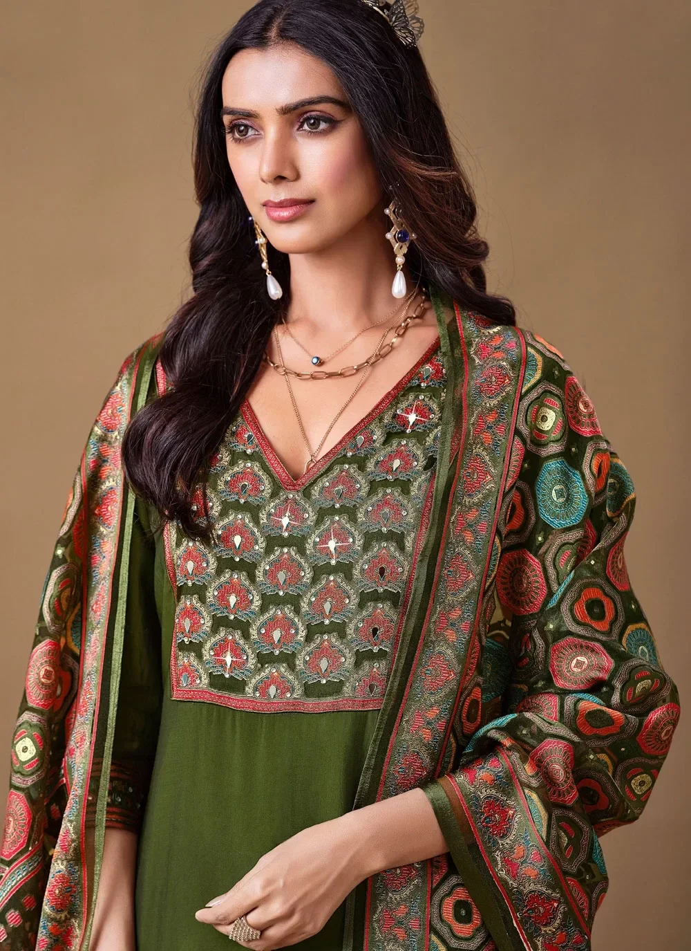 Salwar Suit Set, Roman Silk, Mirror work Neckline, Brasso Dupatta
